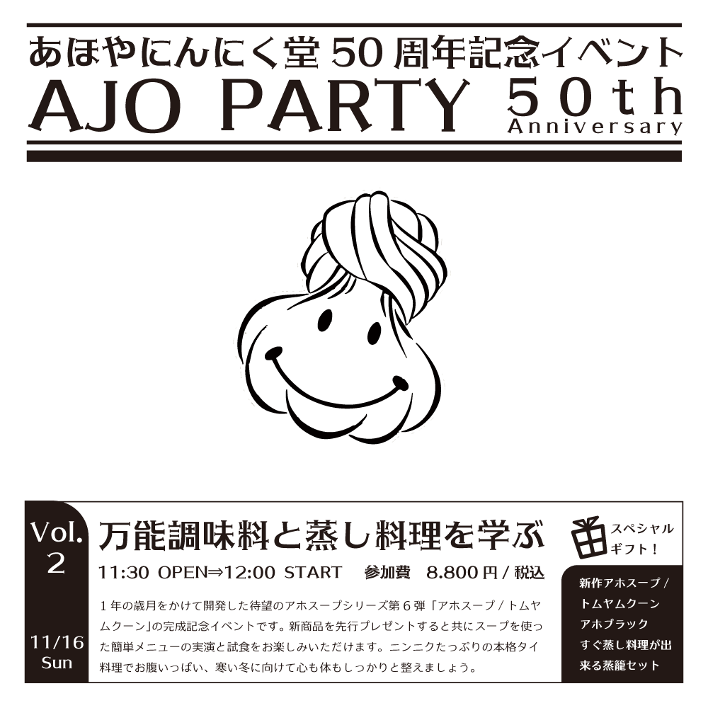 11/16[日] 12:00 -|AJO BASE 店舗イベント開催 AJO PARTY VOL.2【万能調味料と蒸し料理を学ぶ】