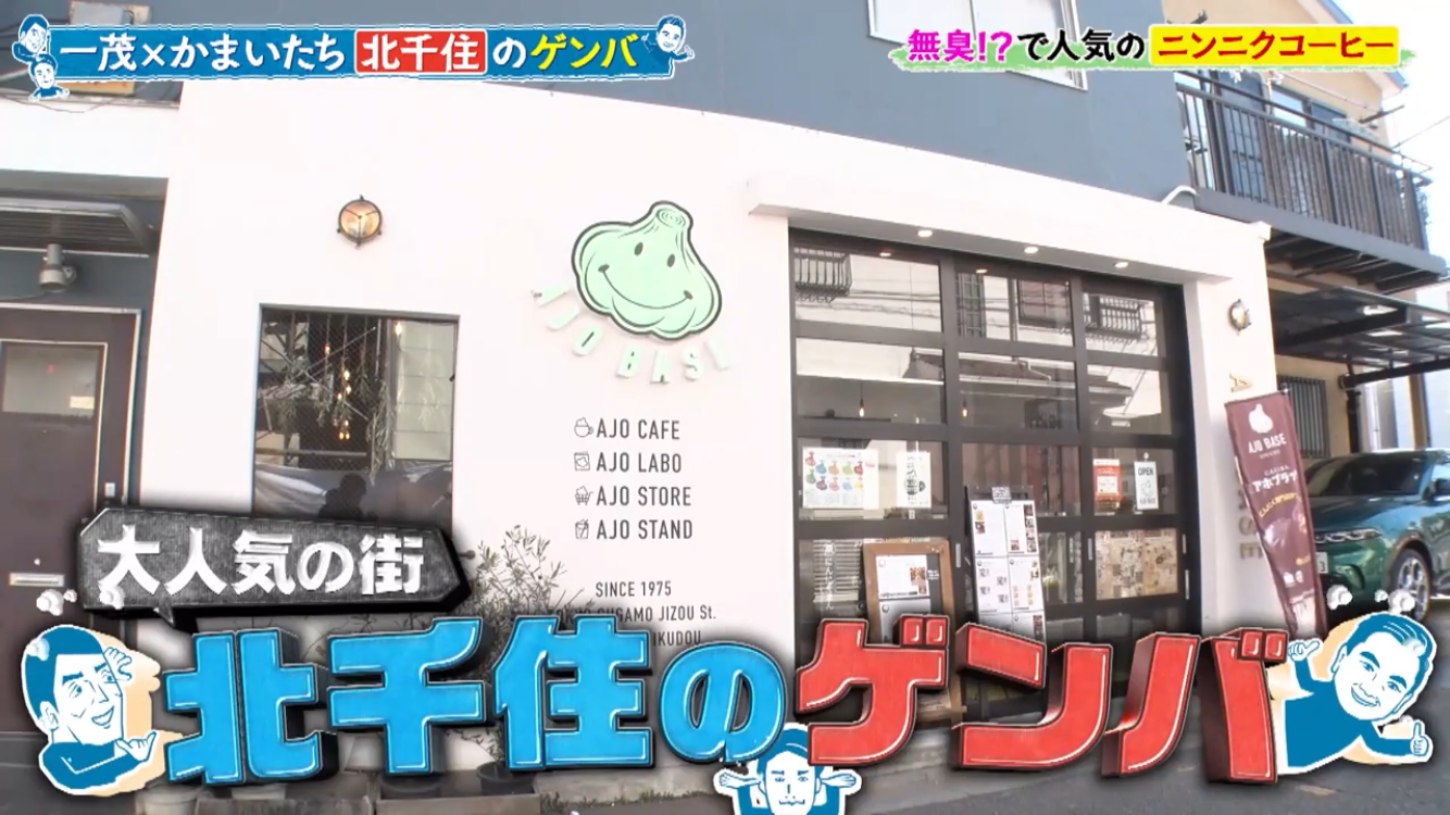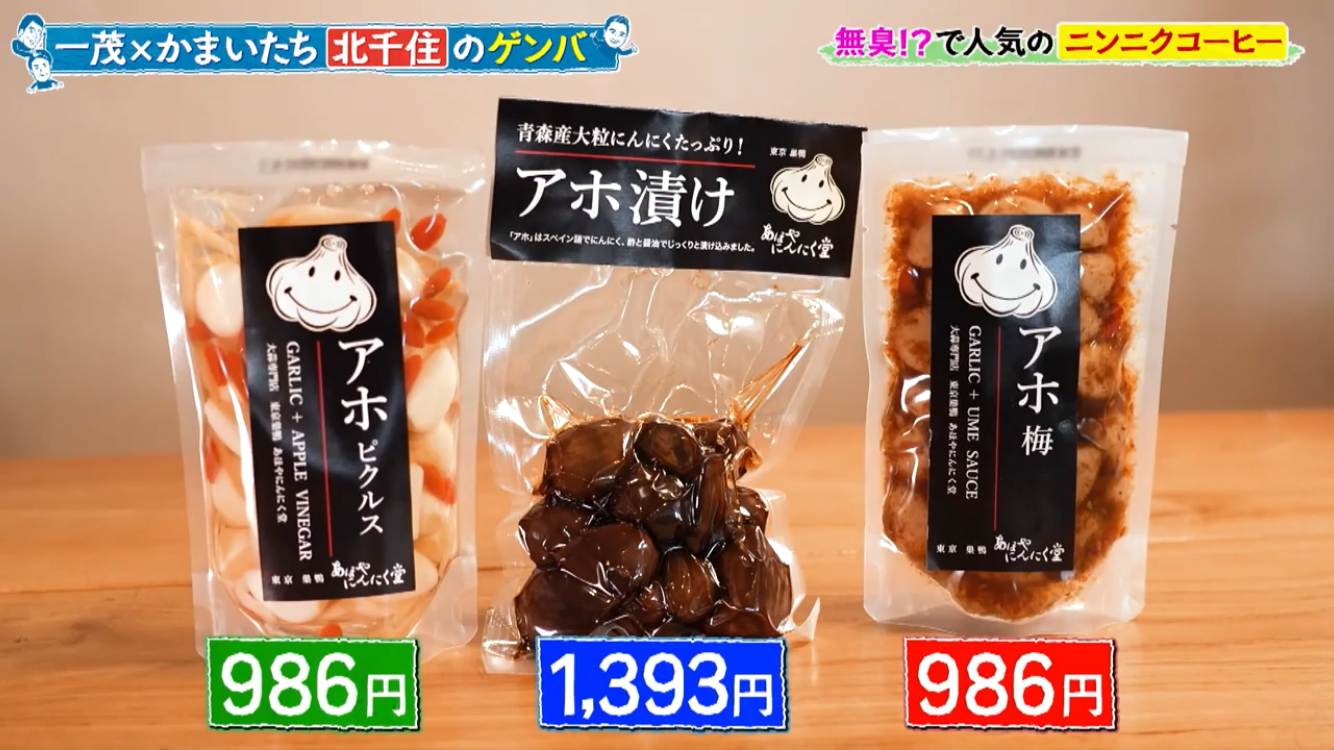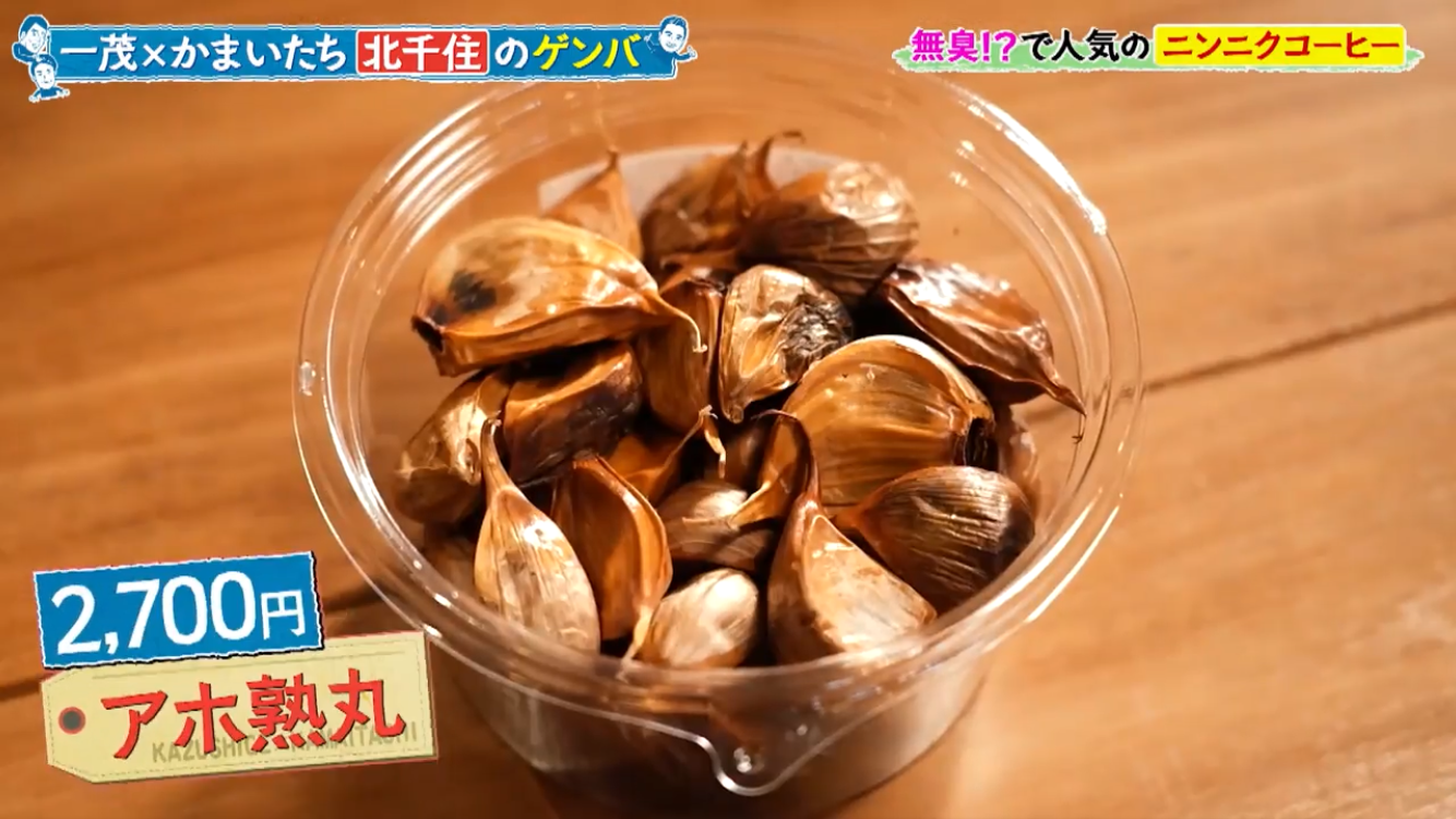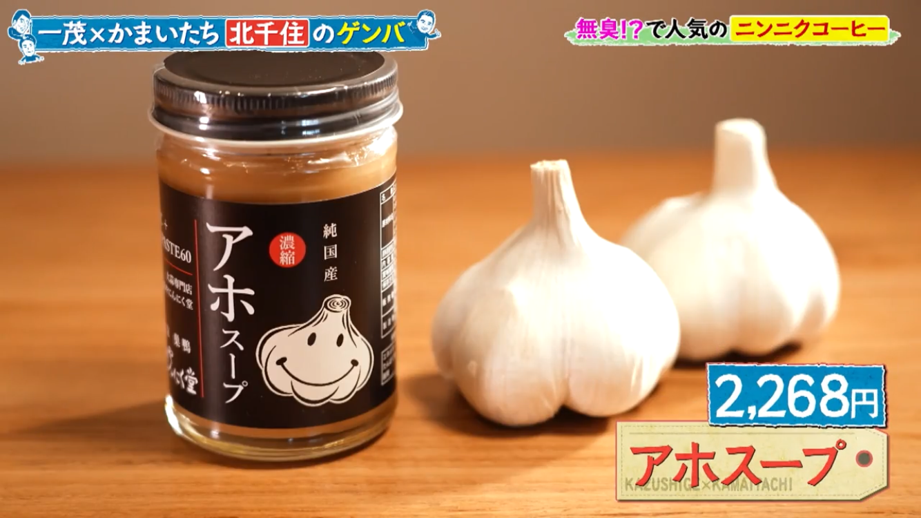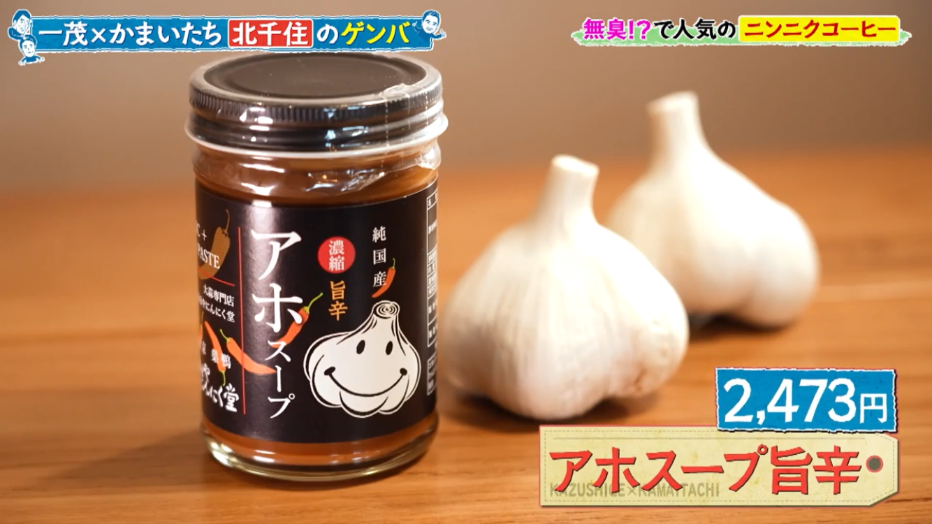 長嶋一茂さん、かまいたちの浜家さんと山内さんのお三方が北千住のアホベイスにご来店。ニンニクスープのアホスープ(鶏ガラベース、旨辛)、にんにく漬物3種、黒にんにく珈琲のアホベイス珈琲、黒にんにく、チーズタップリの当店大人気にんにくパンのアホパンを召し上がられ、気に入っていただけました。ご来店いただき誠にありがとうございます!